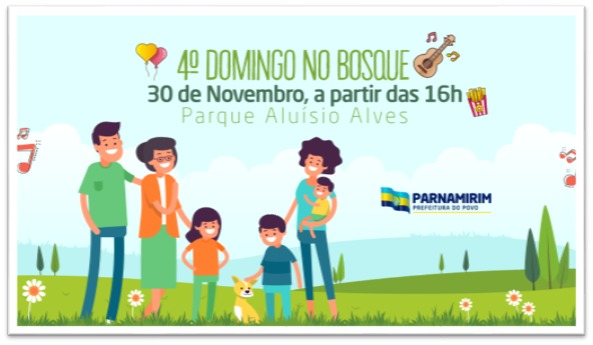 A Prefeitura de Parnamirim, por meio da Secretaria Municipal de Cultura (Semuc), realizará no próximo domingo (30), a partir das 16h, a 4ª edição do Domingo no Bosque, promovendo lazer e cultura para as famílias parnamirinenses. O evento é totalmente gratuito, com o objetivo de garantir diversão, entretenimento e cultura para as crianças e suas famílias, com apresentações, música e muitas atividades.