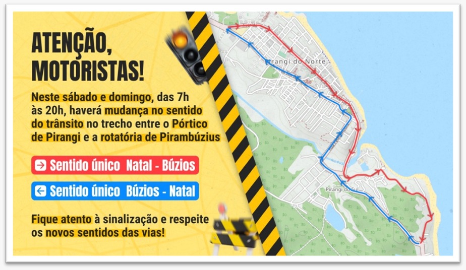A Prefeitura de Parnamirim, atendendo a solicitações da população residente no litoral, vai realizar, neste final de semana, uma inversão de trânsito na área do Pórtico de Pirangi até a rotatória da Praia de Búzios. O objetivo será melhorar a mobilidade no trecho e desafogar o trânsito na região, especialmente em Pirangi. A inversão vai funcionar das 7h até as 20h deste sábado (13) e domingo (14). Confira: